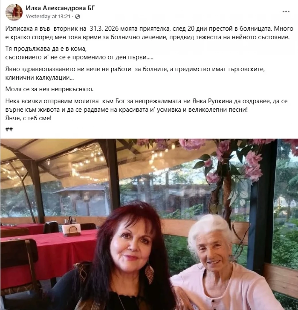 Обичана народна певица Янка Рупкина, която в средата на март беше приета в болница в тежко състояние, е била изписана от болничното заведение, съобщи нейната приятелка - певицата Илка Александрова. "Изписаха я във вторник на 31.3. 2026 моята приятелка, след 20 дни престой в болницата. Много е кратко според мен това време за болнично лечение, предвид тежестта на нейното състояние.", пише още Александрова в своя Facebook профил.