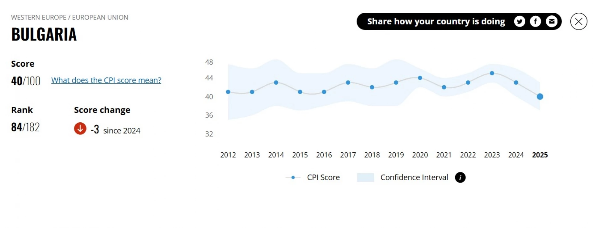 България заема незавидното 84-о място в световната класация „Индекс за възприятие на корупцията“ на международната организация Transparency International. Подреждането, което традиционно се прави всяка година, през 2025 г. ни поставя на три позиции под резултата от 2024. Това е и най-лошото ни класиране от 2012 г. насам, когато имаме 41 точки – сега те са 40. През тези 13 години страната ни се е движила в диапазона между 41 и 45 пункта. Лекият пик е през 2023, но оттогава настъпва слизане надолу.