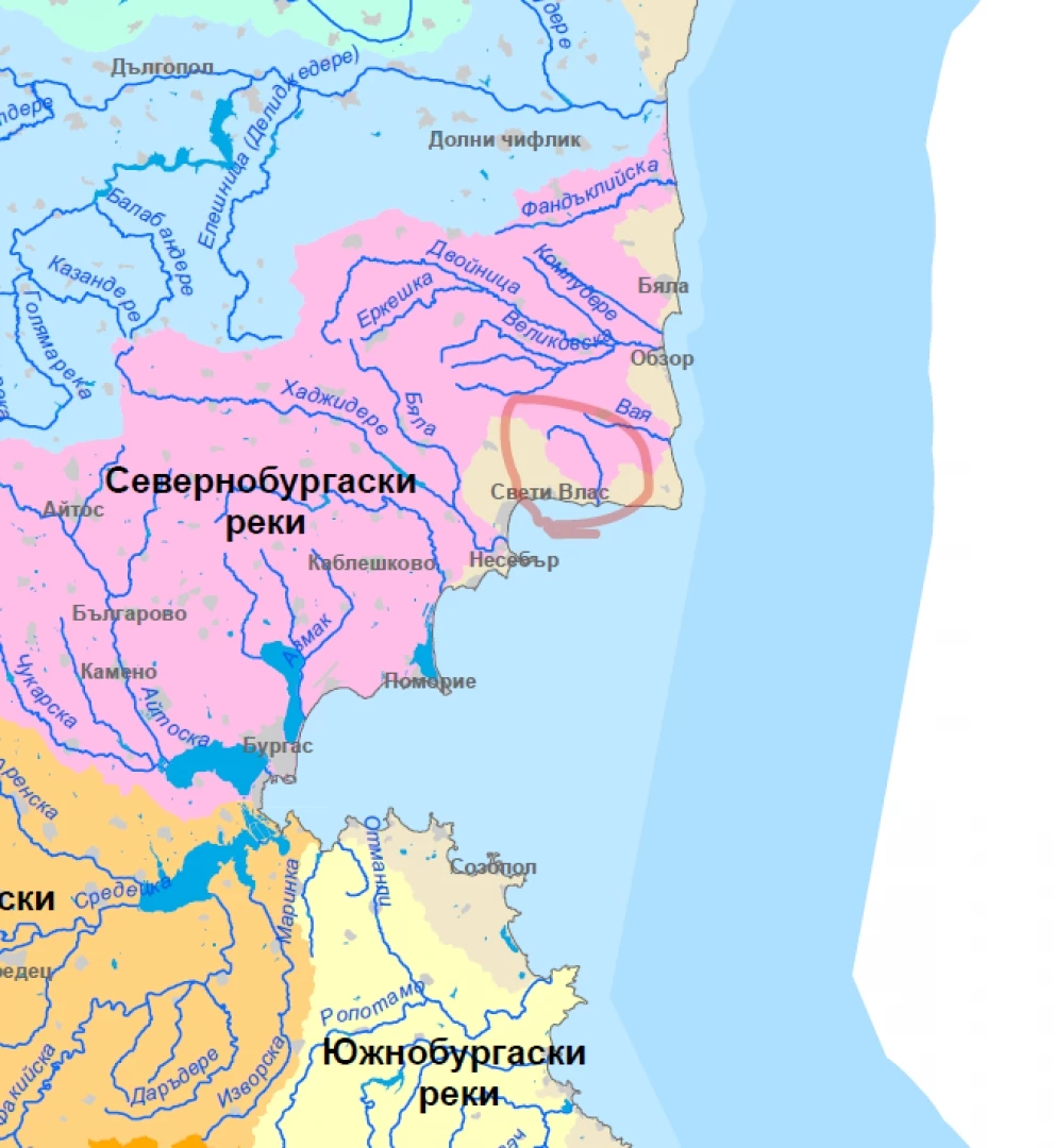 Карта на основните речни басейни в Черноморски район, публикувана в ПУРБ "Черноморски район" 2022-2027. Река Дращела е оградена с червено; източник: Factcheck.bg