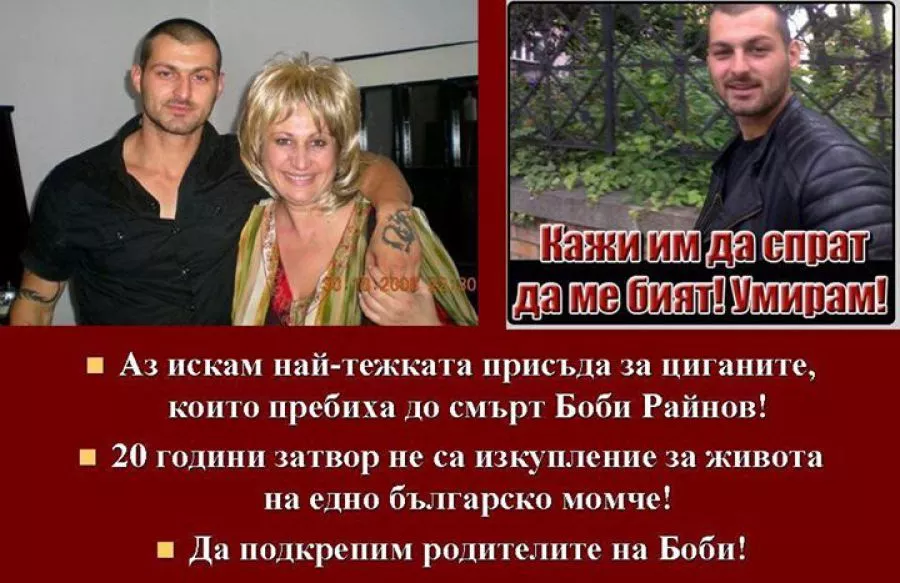 Под картинката, която призовава за справедливост, четем следния текст: "През 2010 година 40 циганина пребиват до смърт едно българско момче. Той се казва Боби Райнов и е искал да предотврати сбиване на други хора. Циганите се организират и налитат да го бият.