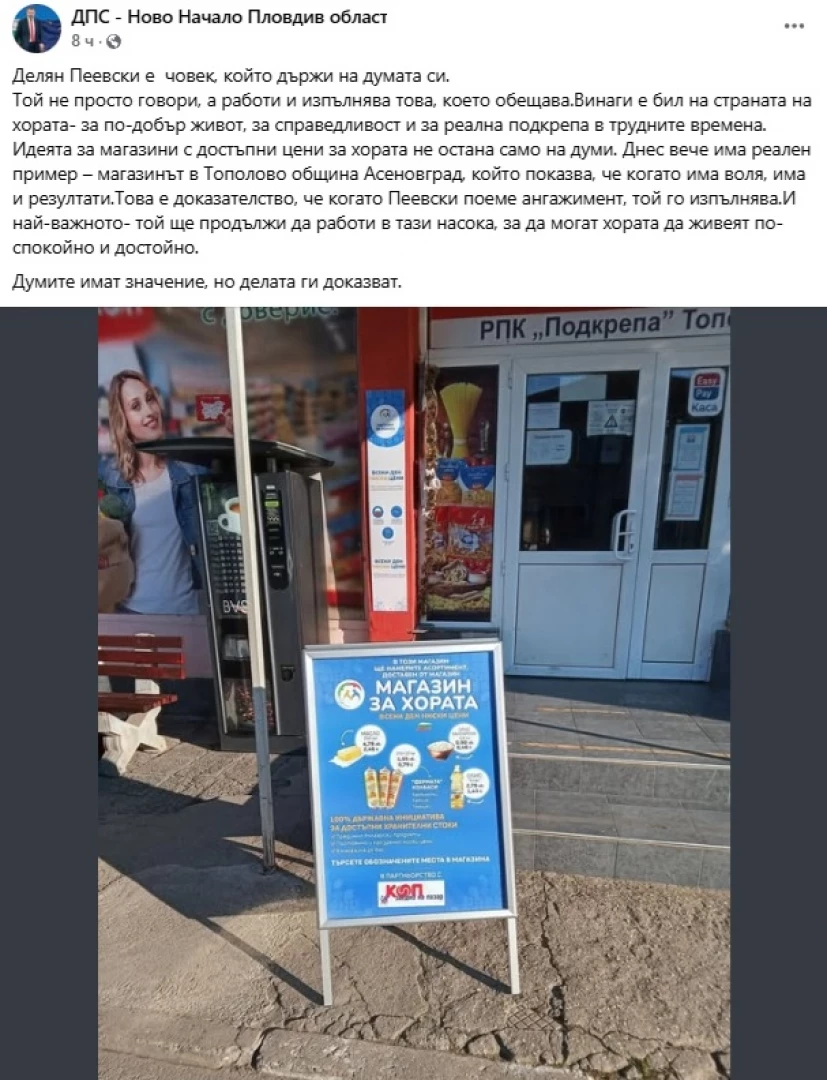 "Идеята за магазини с достъпни цени за хората не остана само на думи. Днес вече има реален пример – магазинът в Тополово община Асеновград, който показва, че когато има воля, има и резултати. Това е доказателство, че когато Пеевски поеме ангажимент, той го изпълнява", твърдят още неговите съпартийци.