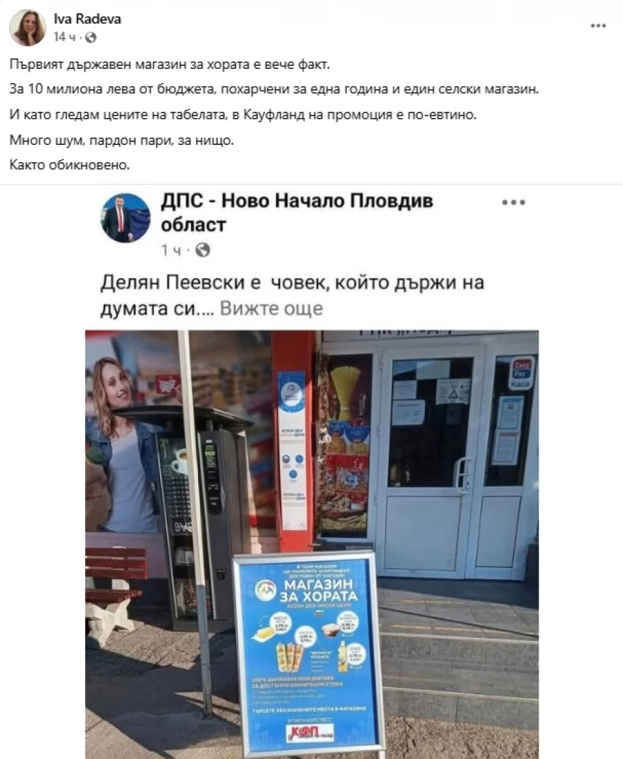 "Първият държавен магазин за хората е вече факт. За 10 милиона похарчени от бюджета толкоз. Много шум, пардон пари, за нищо. Както обикновено", написа бившият областен управител на Стара Загора Ива Радева.