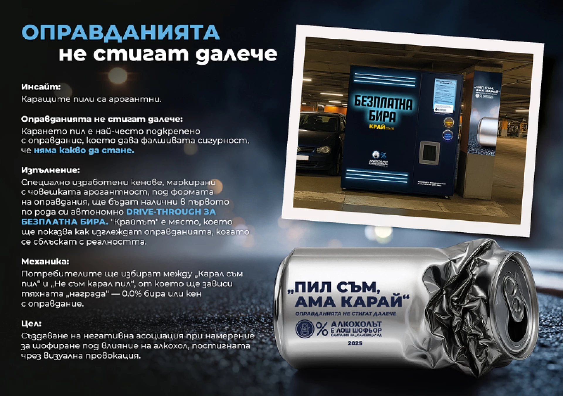 "Оправданията не стигат далече" е провокираща кампания, но по един отговорен и смислен начин. Търсихме силни послания, към които да не можеш да останеш безразличен. Трябваше ни и смела механика, с която да накараме хората да ги чуят, да се замислят и може би да направят правилния избор, преди да седнат зад волана следващия път. Защото оправданията могат да сложат край на пътя, но само ако сме слепи за алтернативата. Затова с "КРАЙпът" не заклеймяваме, а отваряме очи", заяви Гергина Дерилова, която представи креативната концепция и посланията на кампанията.