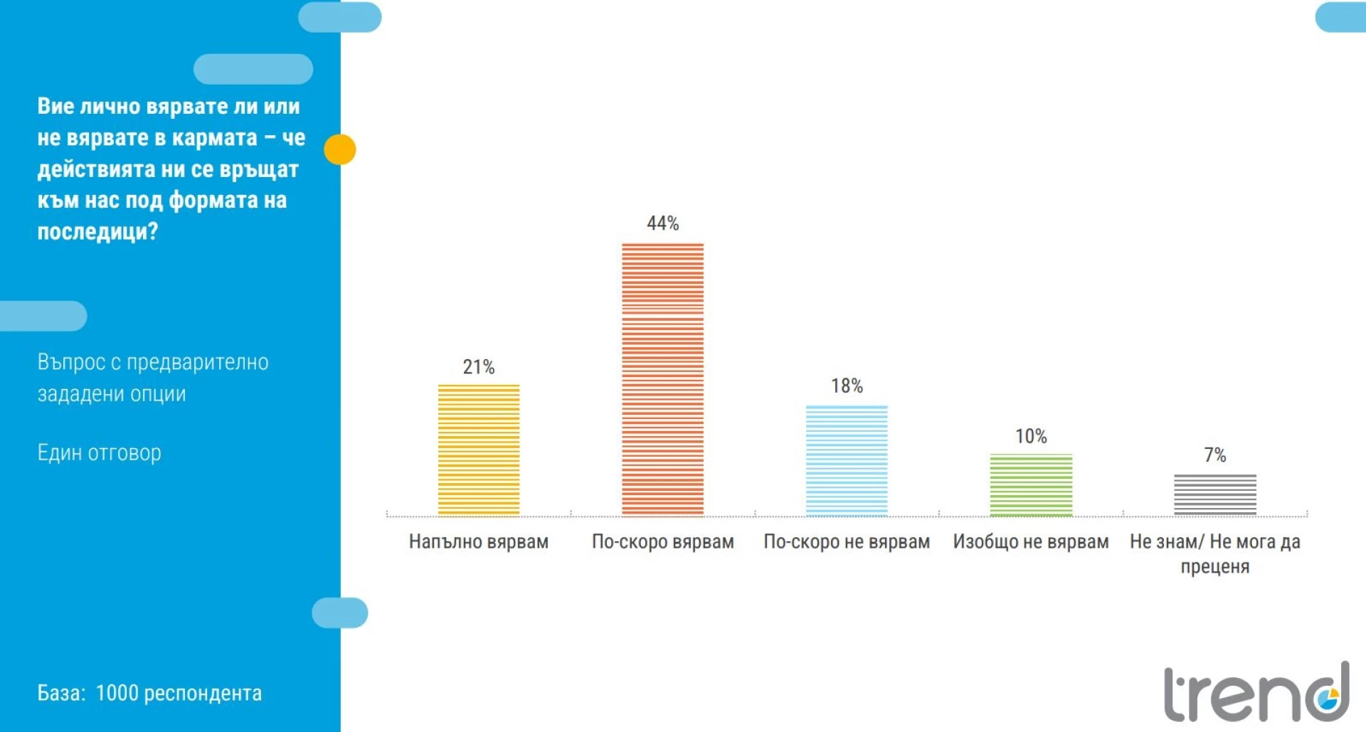 Най-широко разпространено сред българите е убеждението, че "всичко се връща" – 65% от анкетираните вярват в кармата, или приблизително над 3,5 милиона души. Жените са по-склонни да вярват в кармата за сметка на мъжете. Едва 10% посочват, че изобщо не вярват.