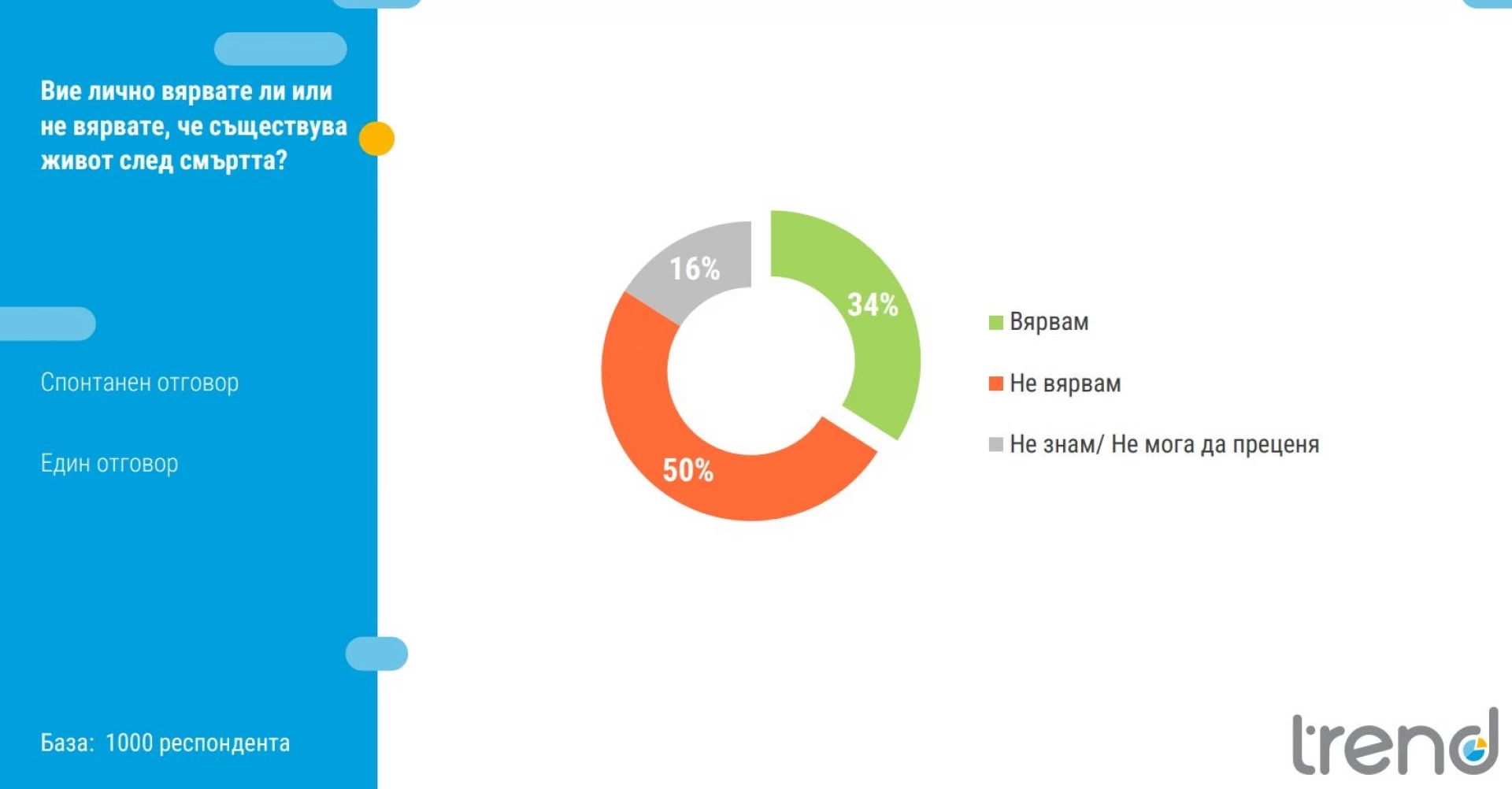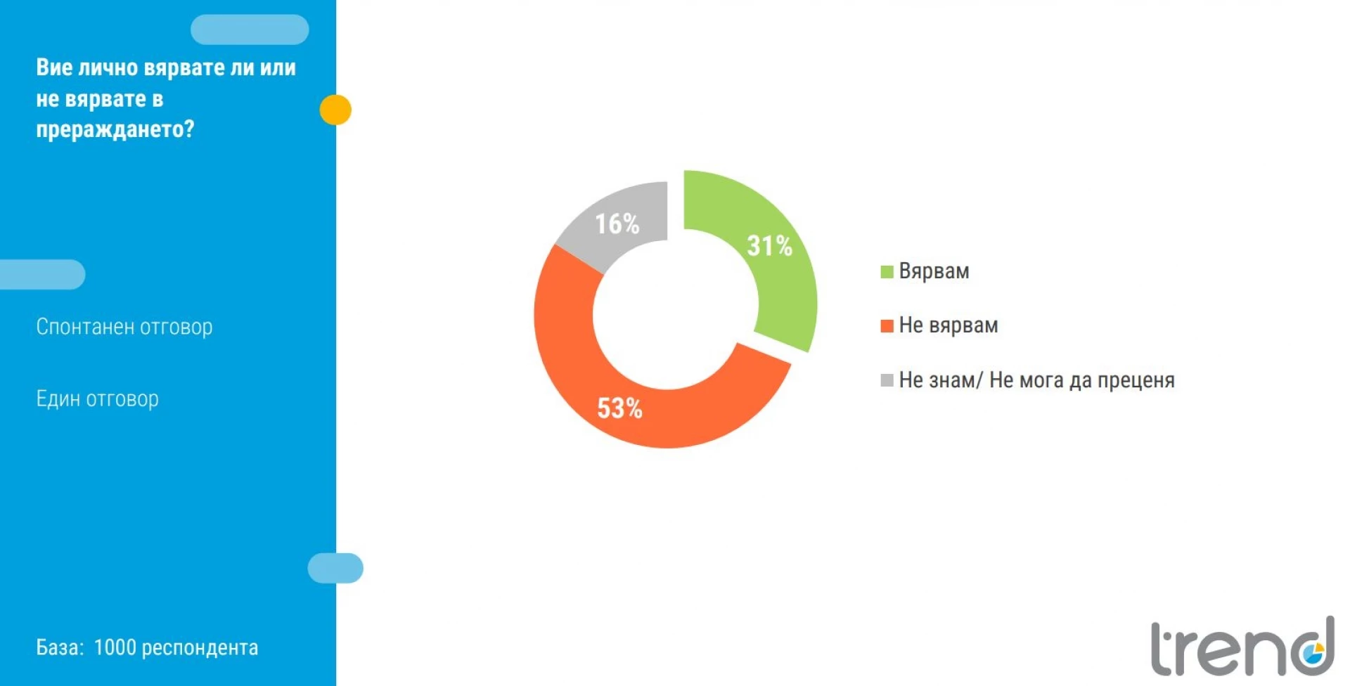 31% вярват, че човек се преражда, докато 53% посочват, че не вярват.