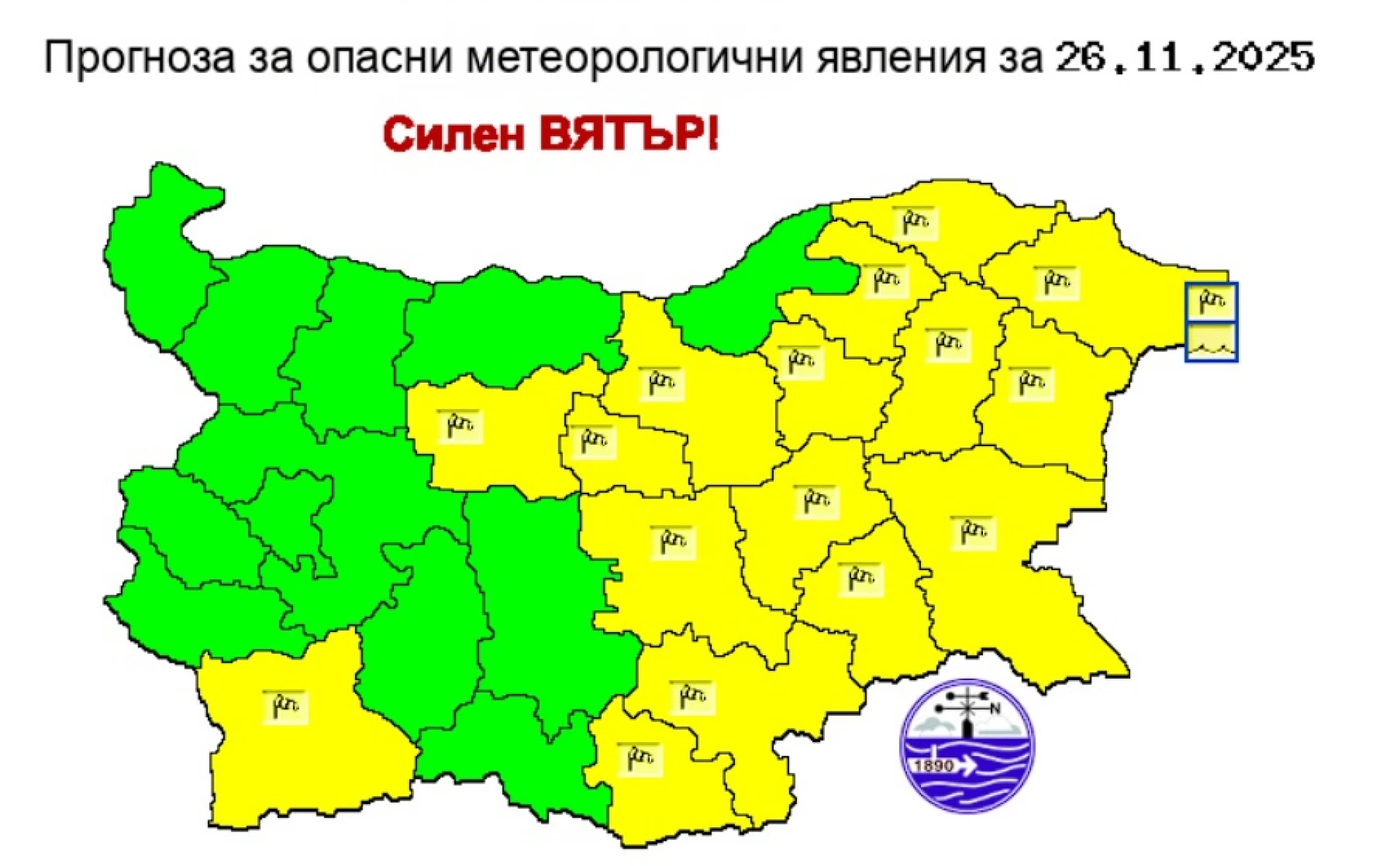 На 26 ноември 2025 г. минималните температури ще бъдат между 3° и 8°, в районите с вятър – до 10°-12°; в София – около 4°. Утре над западната половина от страната ще е предимно облачно и на много места ще има валежи от дъжд, по-значителни в крайните западни и южни райони. Над Източна България облачността ще е разкъсана, там ще духа умерен и временно силен южен вятър. В Западна България вятърът ще се ориентира от северозапад и с него ще започне да нахлува студен въздух. Максималните температури ще бъдат в широк интервал: от 7°-8° в крайните северозападни райони до 18°-20° на места в Източна България и районите, чувствителни на южен вятър, в София – около 12°, показва прогнозата за времето на НИМХ. Обявен е жълт код за силен вятър за централната и източната част от страната.