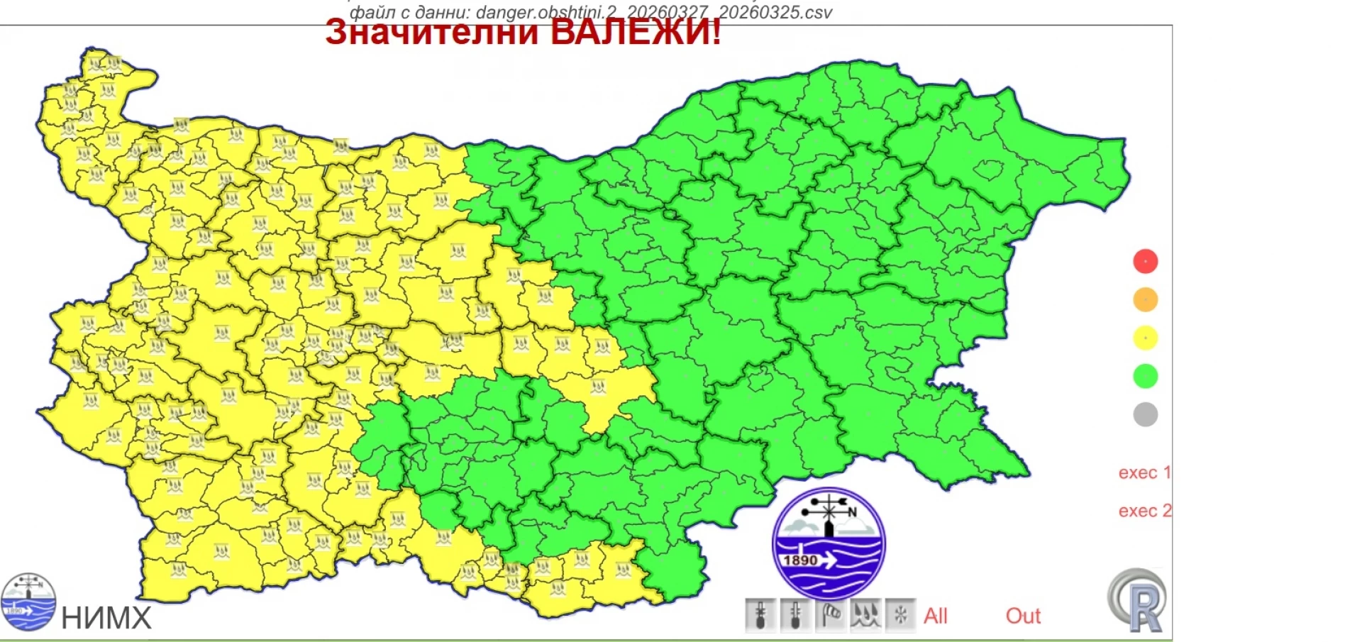 На 27 март 2026 г. в Западна България още от сутринта ще започнат валежи от дъжд, които до вечерта ще обхванат почти цялата страна. По високите части на планините ще вали сняг. На много места валежите ще бъдат придружени с гръмотевици и главно в Западна България и планинските райони значителни по количество. За няколко области в страната е обявен жълт код за интензивни валежи. Минималните температури ще бъдат между 4° и 9°, за София – около 6°, максималните в повечето места - между 11° и 16°, за София – около 12°, показва прогнозата за времето на НИМХ.
