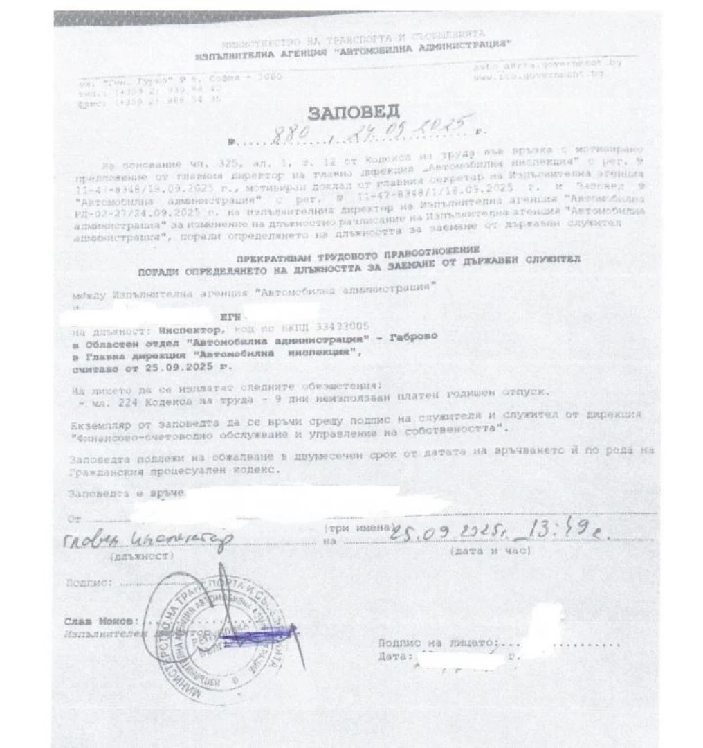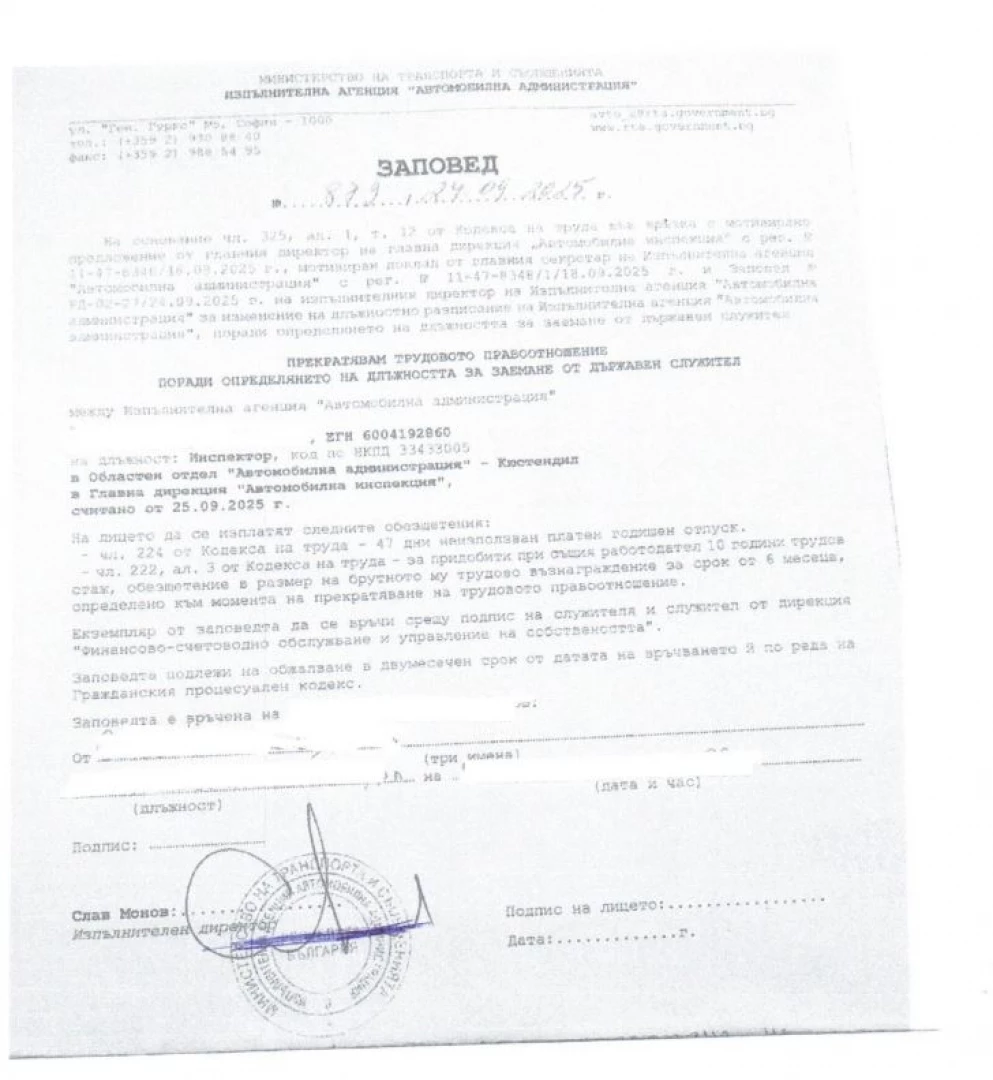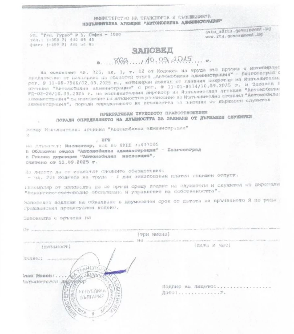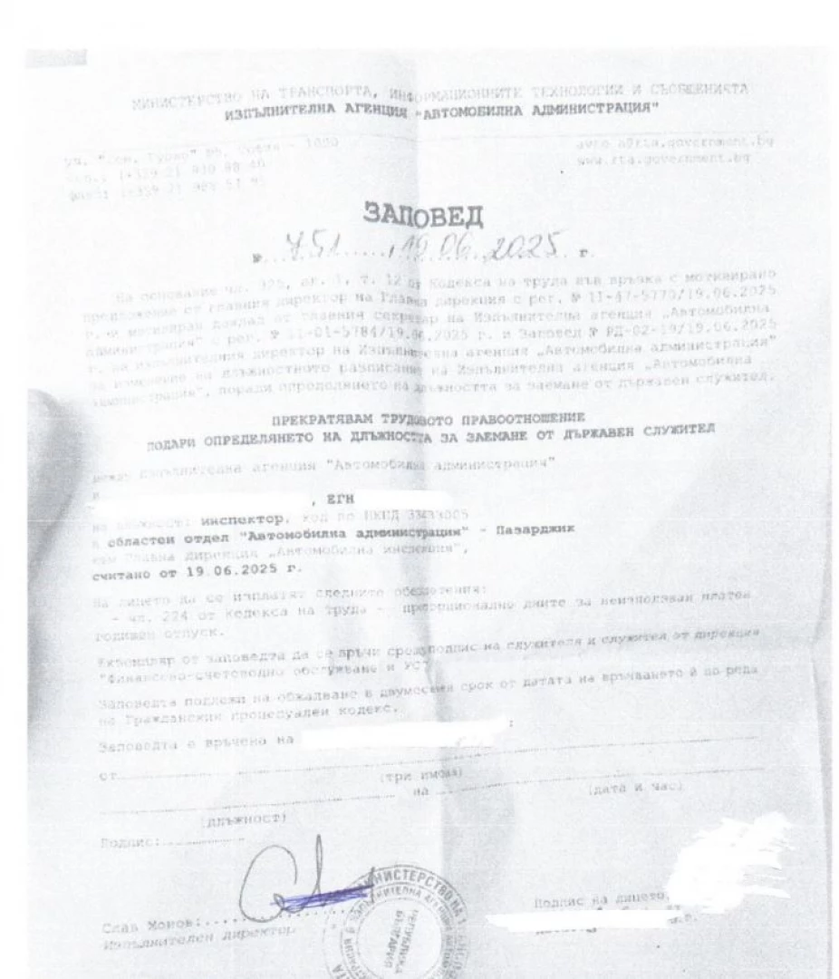 До ИПБ са постъпили копия от заповедите за уволнение на наречените от министъра „корупционери“. В тях като основание за прекратяване на трудовото правоотношение е посочен член от Кодекса на труда, който се прилага при изменение на длъжностното разписание - преобразуване на щата. В момента в Изпълнителна агенция „Автомобилна администрация“ (ИААА) се извършват структурни промени, в резултат на които служителите на трудов договор трябва да преминат на държавен щат.