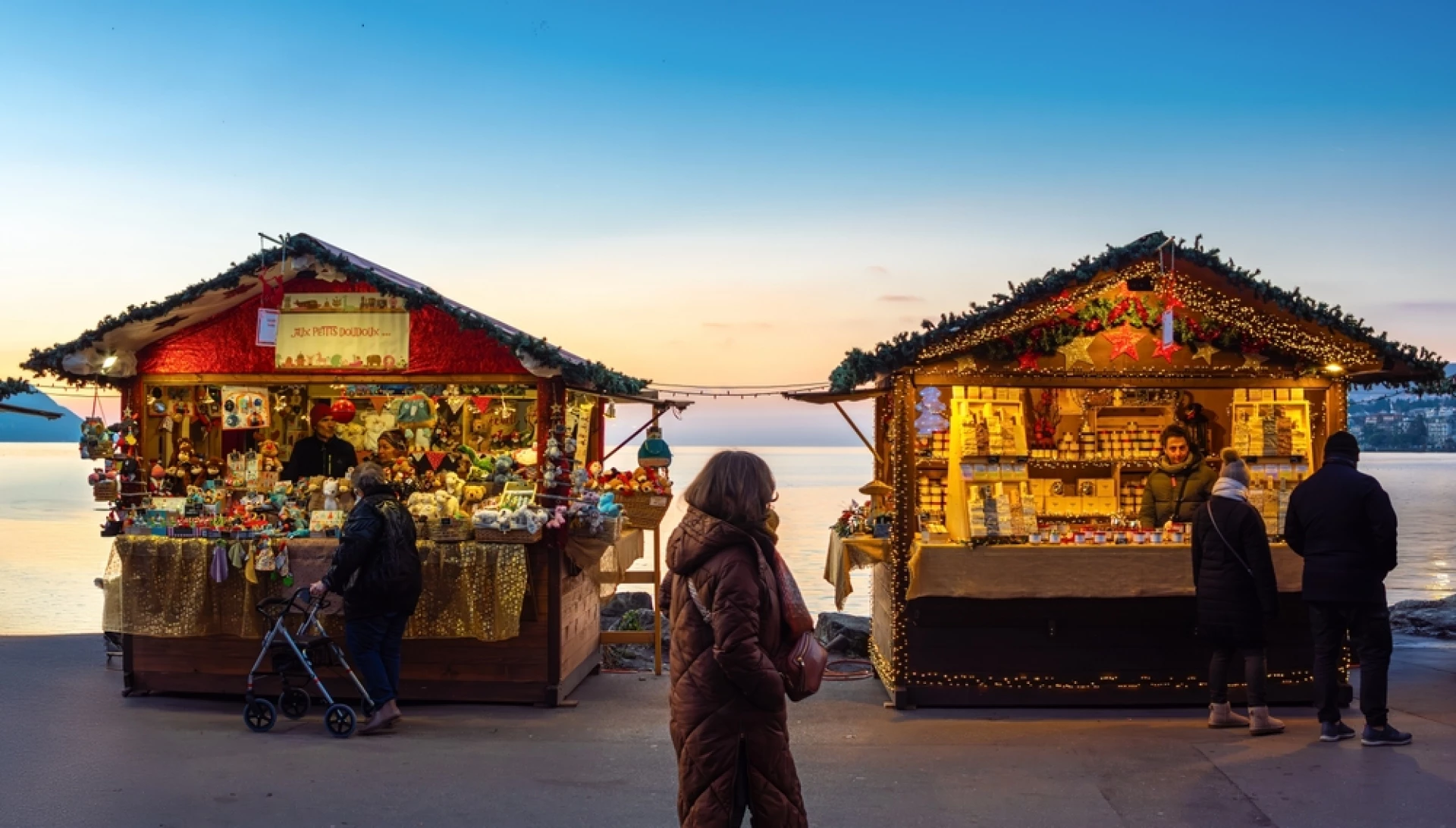 Швейцария по Коледа е онова, което си представяте, когато затваряте очи и мислите за „перфектна зима“. Монтрьо, разположен на брега на Женевското езеро, се превръща в картина, излязла направо от коледна картичка. Но базарът там не е просто търговска улица, а цяла вселена от дървени къщички, осветени фенери и работилнички с алпийски занаяти, които предават вековни традиции. Въздухът мирише на печени кестени и швейцарски шоколад, а заснежените върхове правят всяка снимка достойна за рамка.