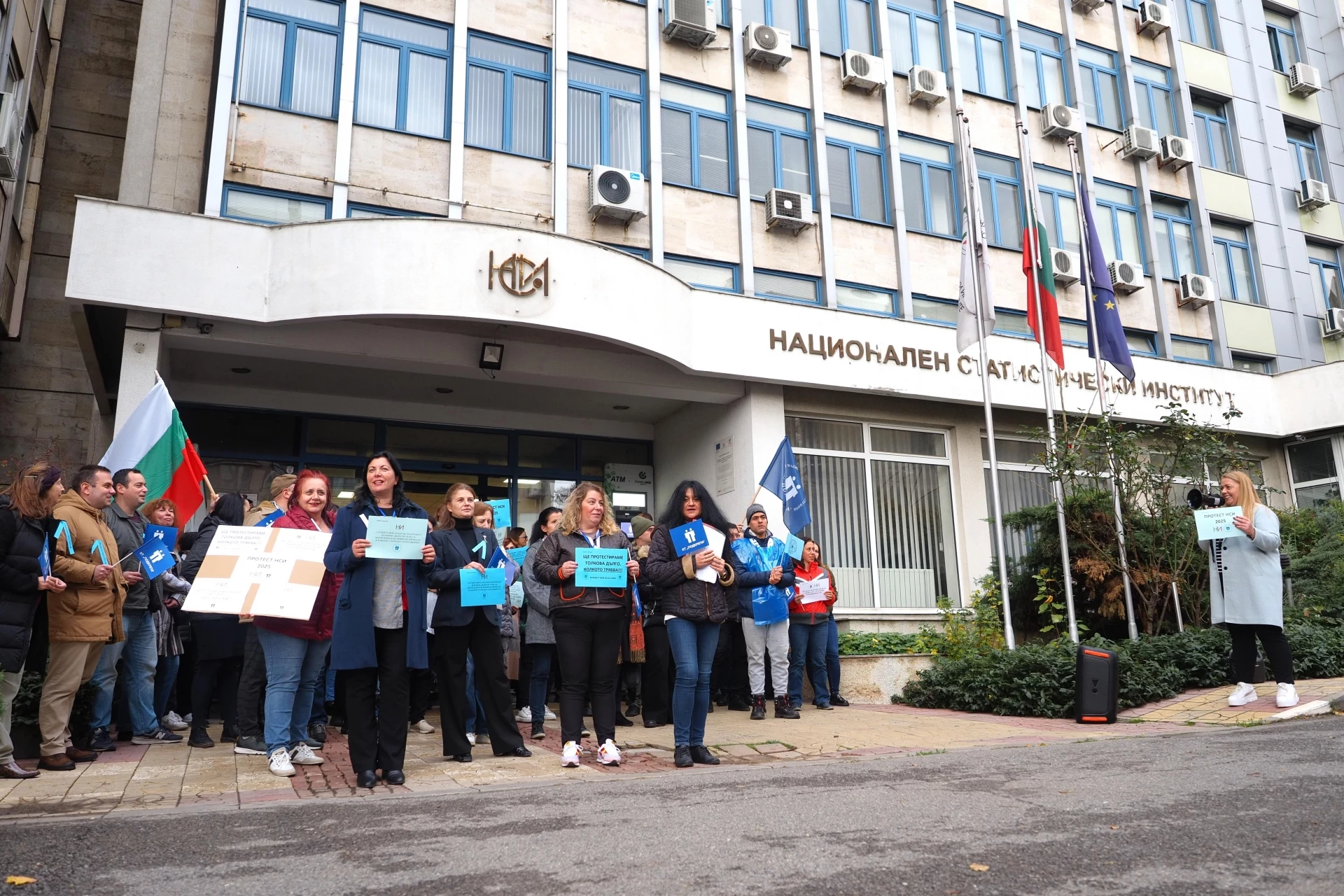 Ключови държавни администрации в цялата страна излязоха на протест. Днес пред сградата на НСИ в София се събраха служителите на института и на Агенция по заетостта. Протестиращите издигнаха плакати с надписи "Ще протестираме толкова дълго, колкото трябва!", "Служителите в НСИ не получават огромни бонуси и не са мързеливи или привилегировани, а работят сериозно и отговорно", "Научете се да цените нас и данните – ние ги осигуряваме".