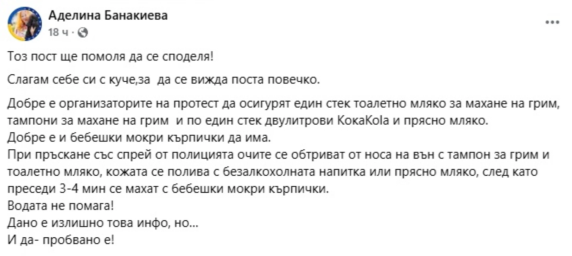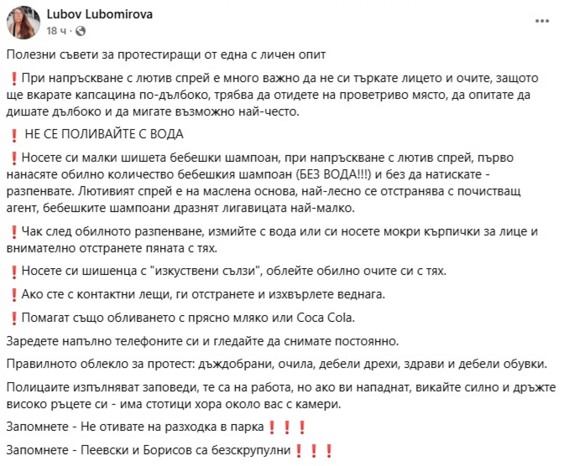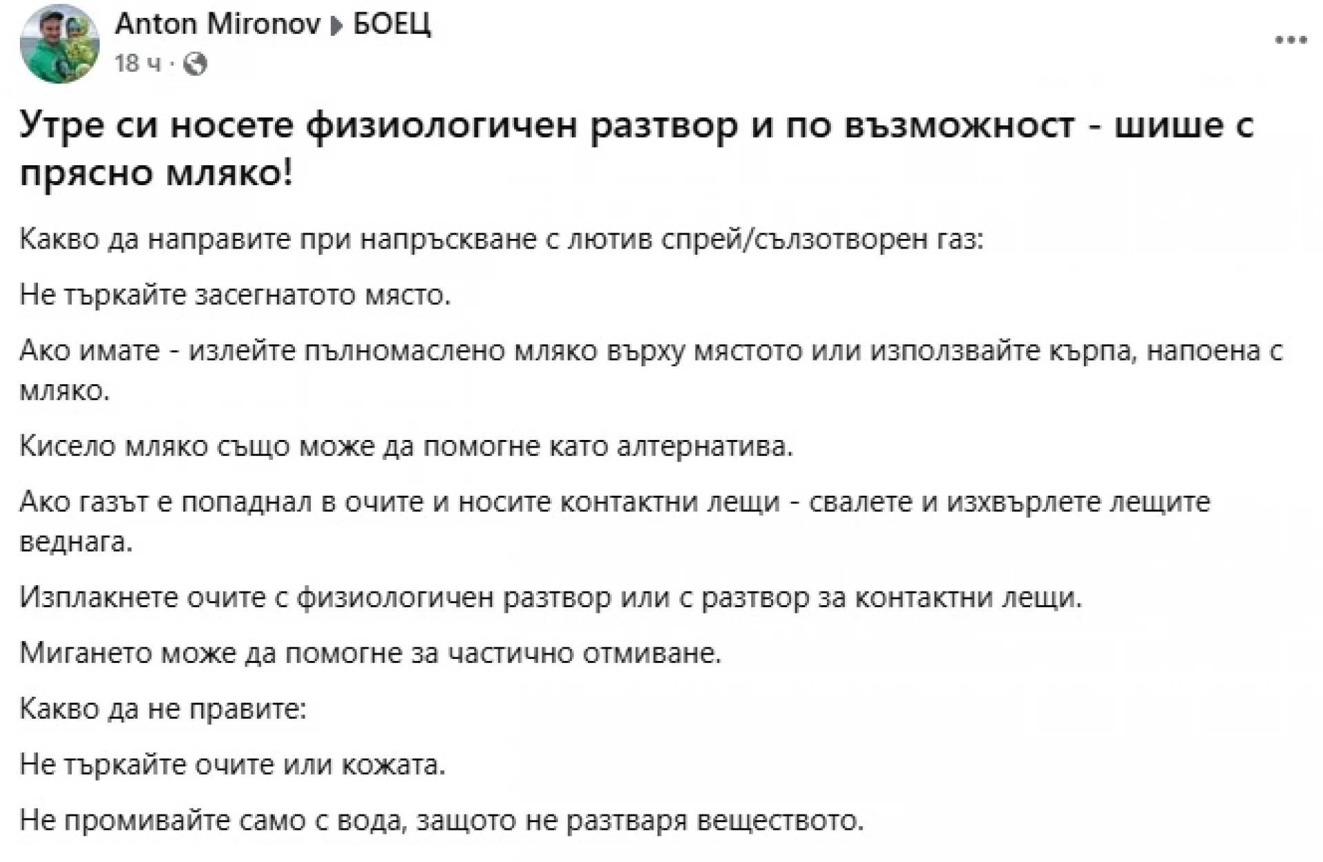 В социалните мрежи мнозина споделят информация кои помощни средства "спасяват" от сълзотворен газ и как всеки да ги използва безопасно. Обгазяването не е честа практика по българските протести и хората у нас нямат голям опит как да реагират в подобни случаи.
