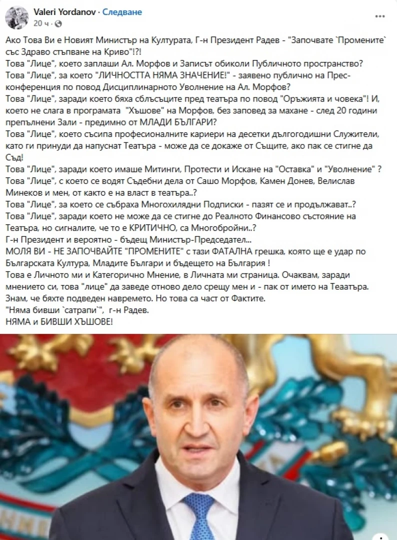 "Ако Това Ви е Новият Министър на Културата, Г-н Президент Радев - "Започвате "Промените" със Здраво стъпване на Криво", написа Йорданов.