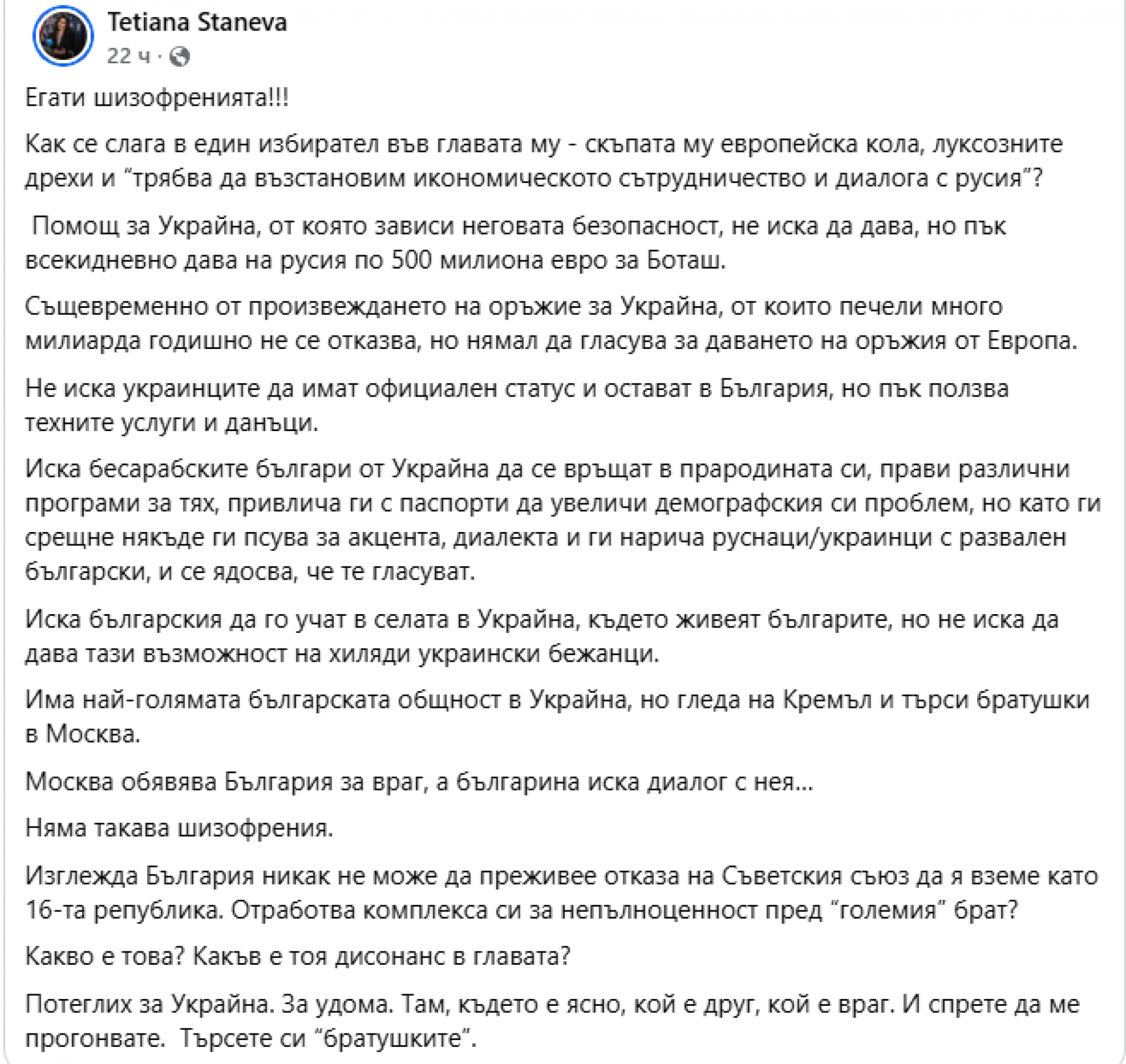 "Няма такава шизофрения. Изглежда България никак не може да преживее отказа на Съветския съюз да я вземе като 16-та република. Отработва комплекса си за непълноценност пред “големия” брат? Какво е това? Какъв е тоя дисонанс в главата?" Това попита в профила си във Facebook Тетяна Станева – бесарабска българка, директор на Международния фестивал на етнографското кино "ОКО", коментирайки провелите се в неделя предсрочни парламентарни избори у нас. Публикуваме целия текст