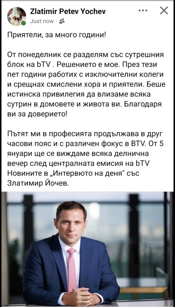 "От 5 януари ще се виждаме всяка делнична вечер след централната емисия новини на bTV Новините в "Интервюто на деня" със Златимир Йочев", пише още водещият, с което потвърждава, че заменя над 3-часов сутрешен ефир за няколко минутен слот във вечерния новинарски блок от 19:50 часа.