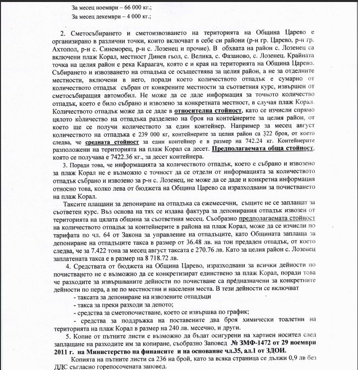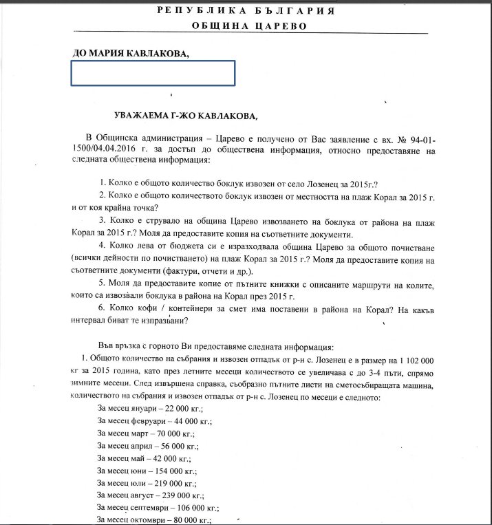 В тази връзка Кавлакова е изпратила заявления за достъп до информация до кметовете на две от общините, които имат отношение по темата и са често цитирани – Бяла, на чиято територия е плажът Карадере и Царево, където се намира Корал.