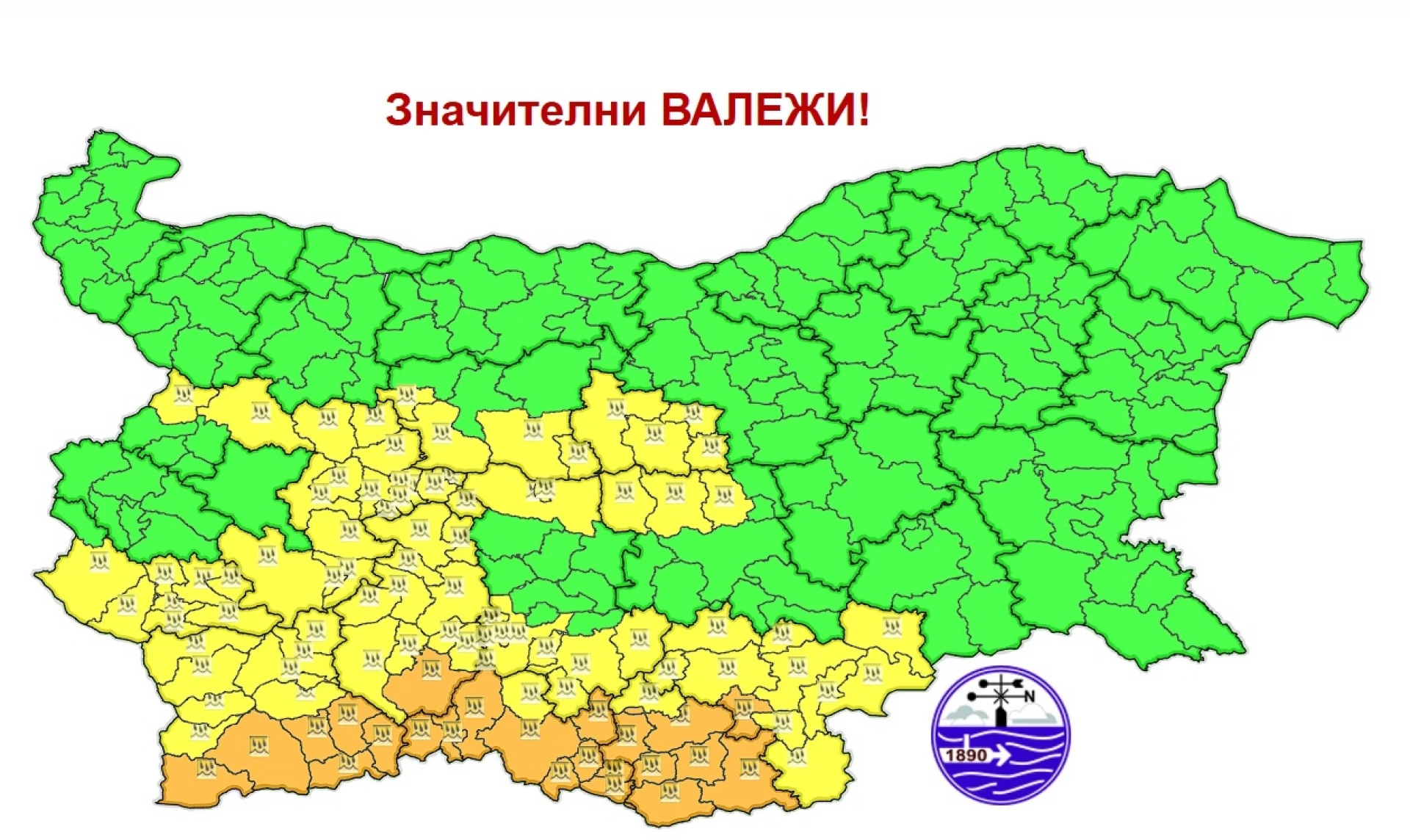 Оранжев код за значителни валежи е обявен за областите: Благоевград, Пазарджик, Смолян и Кърджали. Жълт код за София-обаст, Кюстендил, Хасково, Пазарджик, Пловдив, Ловеч и Габрово.