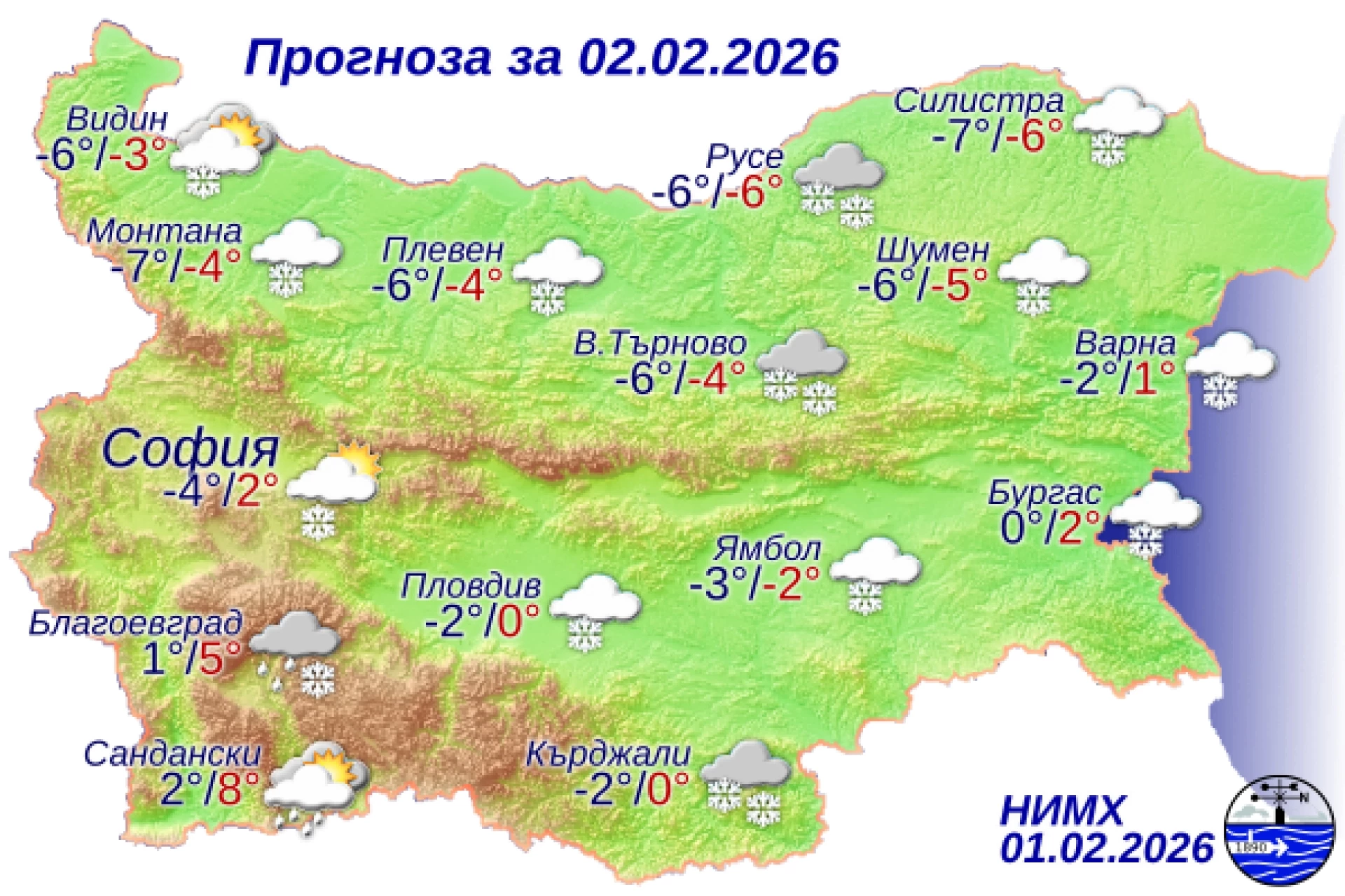 В Северна България температурите ще са почти без денонощен ход, между минус 7° и минус 4°. В южната половина от страната минималните температури ще са между минус 3° и 2°, максималните ще са от минус 3° - минус 1° в Горнотракийската низина до 8° в Сандански. В София минималната температура ще е около минус 4°, максималната - около 2°.