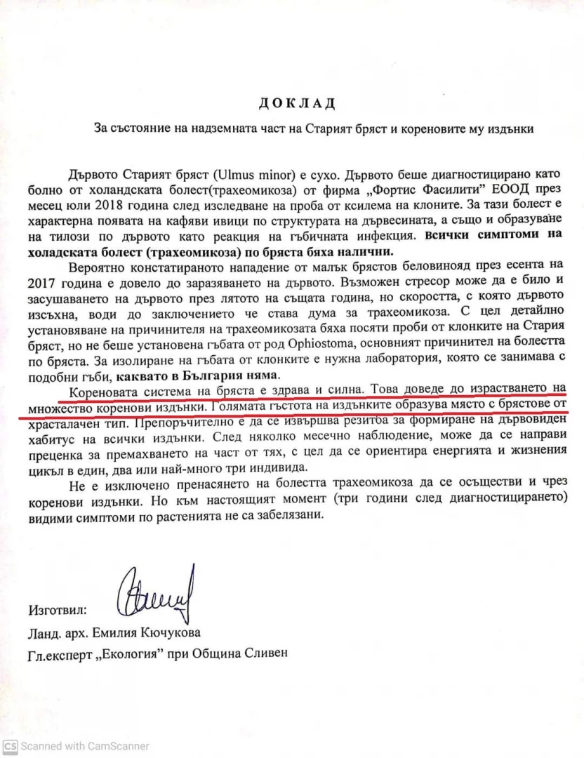 "Въпреки положените усилия за спиране на процесите на деградация на посоченото от Вас вековно дърво и приложените различни методи за стабилизиране на здравословното му състояние, през 2020 г. по предложение на Община Сливен със заповед от 18.12.2020 г. (обн. ДВ бр.13/2021 г.) на министъра на околната среда и водите вековното дърво „Старият бряст“ е заличено от Държавния регистър на вековните и забележителни дървета поради невъзстановимо увреждане вследствие на изсъхване. Към настоящия момент в МОСВ, респ. РИОСВ – Стара Загора, не е получавана информация за промяна в състоянието на дървото от Община Сливен като собственик на имота, в който е разположено дървото.", се казва още в официалния отговор на МОСВ за състоянието на дървото. Фактите, обаче говорят друго.
