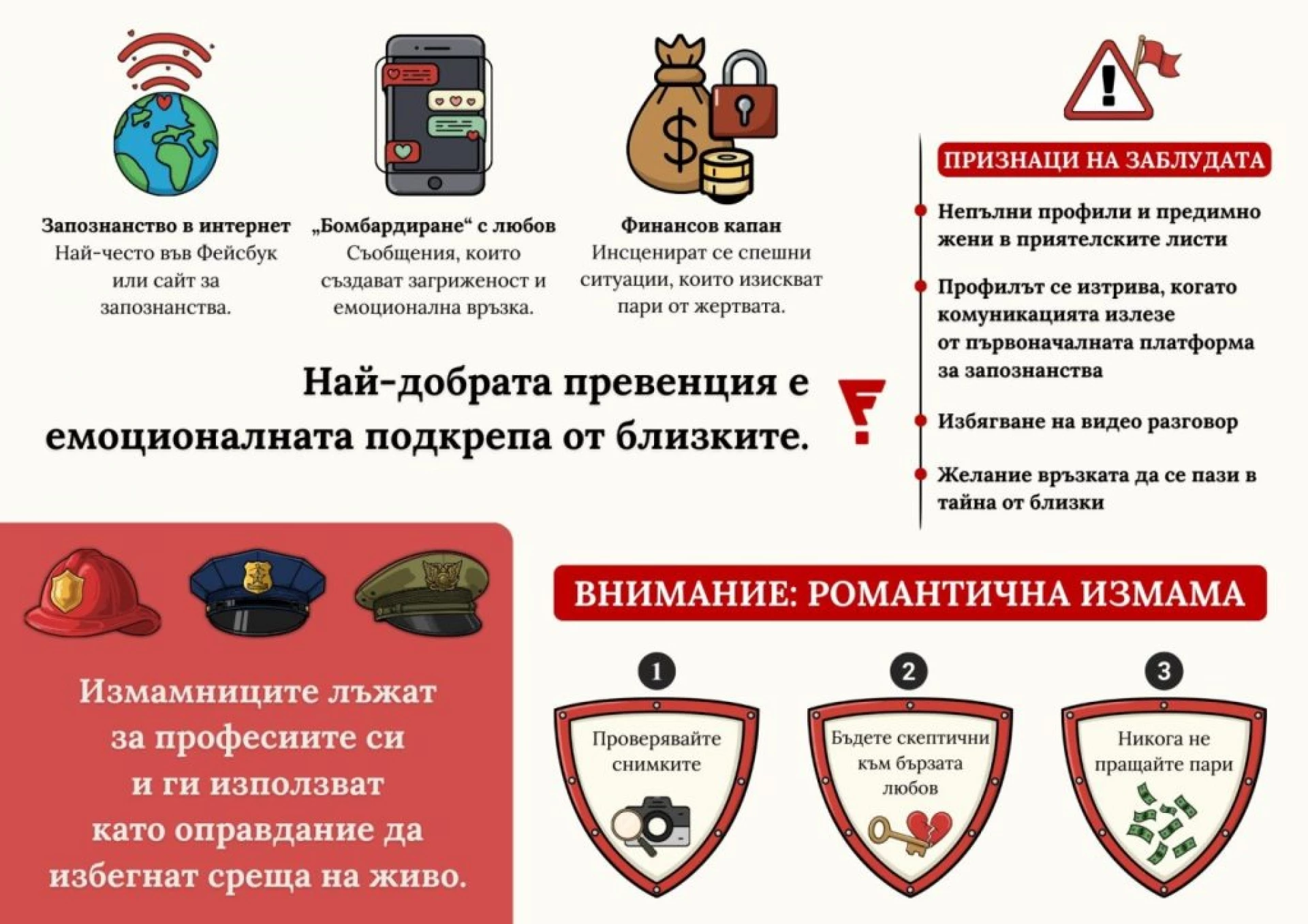 Романтичните измами са често срещани престъпления, които могат да засегнат всеки, без значение на пол, възраст, социална група и образование, посочва за Factcheck.bg Златка Падинкова, началник сектор „Измами“ в Главна дирекция „Национална полиция“ (ГДНП). По думите ѝ обикновено измамниците са част от международна престъпна схема, която борави с похватите на емоционалната манипулация. С помощта на такива техники и фалшиви онлайн профили измамниците изграждат доверие и зависимост между себе си и жертвата. След като вече е налице емоционална връзка, измамниците инсценират спешни ситуации, за които им е нужна финансова помощ от жертвата. Понякога жертвите разбират, че са попаднали на измамник още след първата подобна молба, но в повечето случаи осъзнаването идва късно – след сериозни финансови загуби.