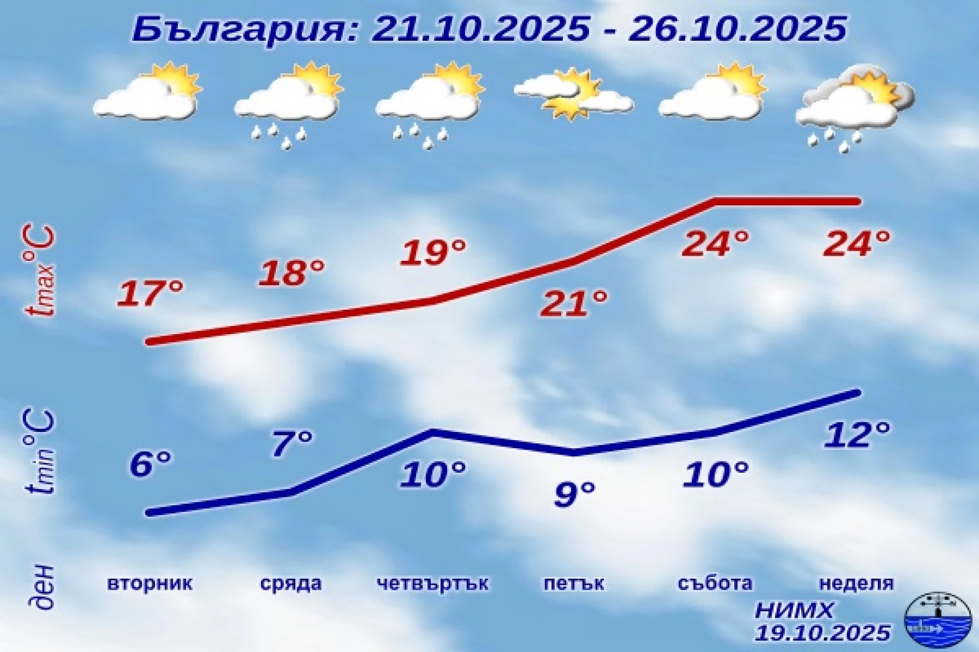 В сряда и четвъртък ще има по-значителни временни увеличения на облачността и на отделни места в западните и планинските райони е възможно да превали слаб дъжд. В петък ще бъде предимно слънчево, с минимални температури между 6° и 11°, максимални - около и над 20°. През почивните дни ще се усили вятърът от юг-югозапад, ще остане топло за края на октомври. В събота ще преобладава слънчево време с разкъсана висока облачност, а в неделя от северозапад ще се увеличат и средната и ниската облачност, по-късно през деня ще започнат и валежи.