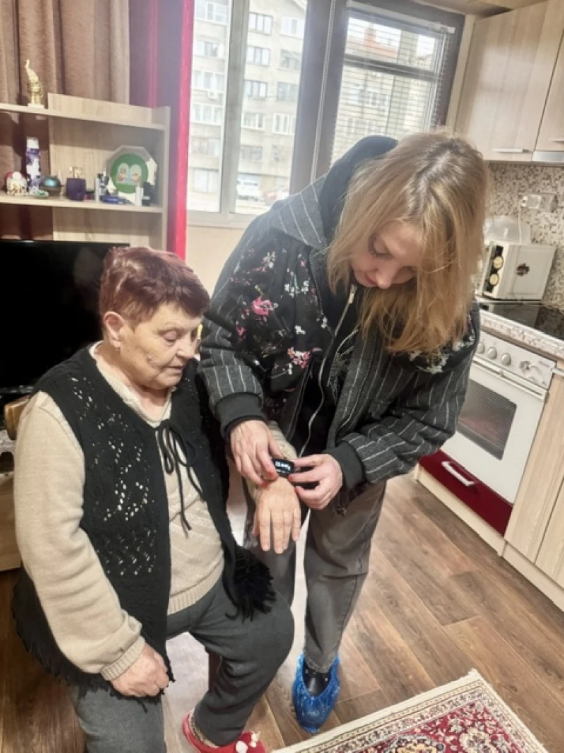 Заради здравословното си състояние и това, че живее сама, тя вече има на ръката си електронна гривна – част от услугата Telecare на А1. Това е система за дистанционна грижа за самотно живеещи възрастни хора, която осигурява връзка с денонощен помощен център при нужда. Гривните се използват от около 500 възрастни в близо 90 общини в страната. Следят жизнените показатели на потребителя и са свързани с уеб платформа с изкуствен интелект. Когато бъде засечена аномалия в здравните показатели – при падане, рязко влошаване или продължителна неподвижност – гривната подава сигнал, а от центъра се свързват веднага с човека и разговарят с него.