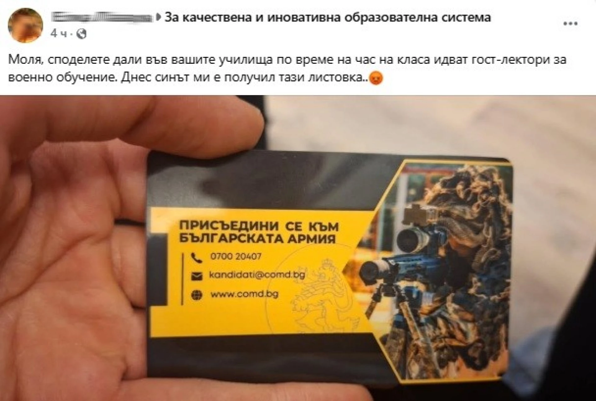 В други училища армейски представители също са агитирали младежите да обмислят присъединяване към армията. Някои родители не скриха скептицизма си по въпроса. "Моля, споделете дали във вашите училища по време на час на класа идват гост-лектори за военно обучение. Днес синът ми е получил тази листовка", пише майка, публикувайки визитка с призив за присъединяване към войската, дадена на учениците.