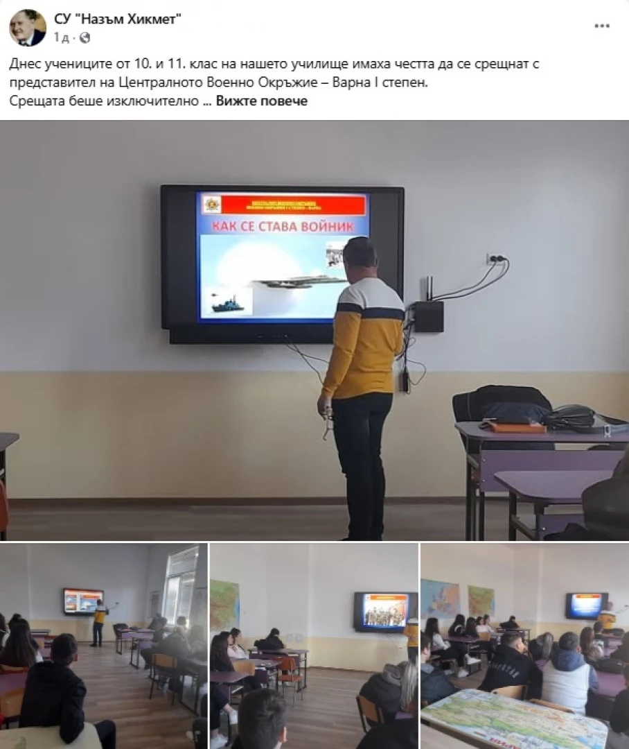"Днес учениците от 10. и 11. клас на нашето училище имаха честта да се срещнат с представител на Централното Военно Окръжие – Варна I степен. Срещата беше изключително полезна и целенасочена, като основната ѝ тема беше представяне на възможностите за професионална реализация и образование в структурите на Българската армия", става ясно от публикацията.