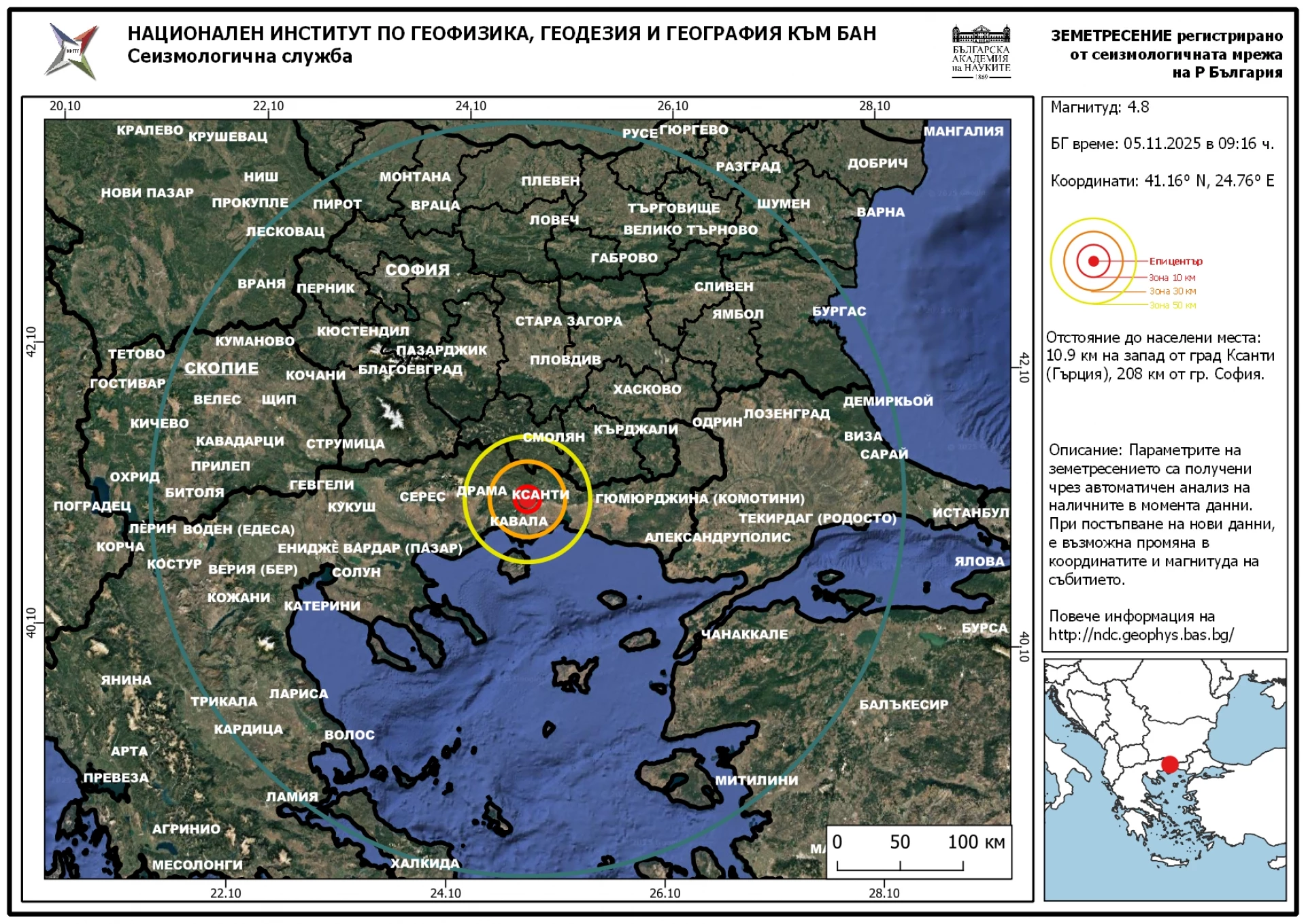 Епицентърът на труса, на дълбочина 7 километра, е на 12 километра западно от Ксанти и 110 километра южно от Пловдив. Земетресението е регистрирано в 09:16 часа днес. Няма данни за пострадали хора или разрушения.