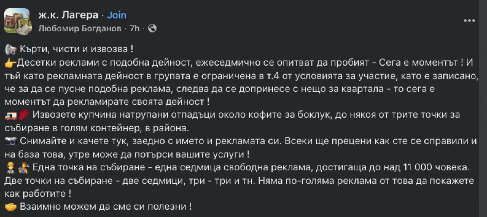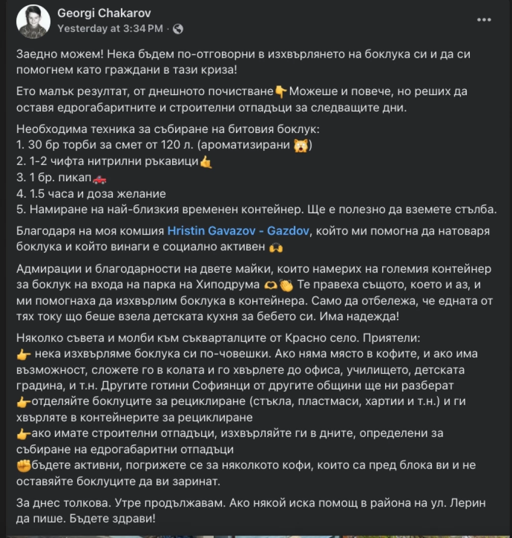 В отговор на ситуацията, жители на кварталите започнаха да се самоорганизират чрез квартални групи във Facebook. Те създават графици, за да почистват около кофите, извозват натрупани отпадъци с лични автомобили и дори публикуват снимки, за да мотивират други да се включат. В някои групи се координират общи акции по почистване през уикендите, а местни търговци предоставят ръкавици и чували. Още: Като войници без муниции с боклука: Районните кметове, такса смет и рисковете за други части на София