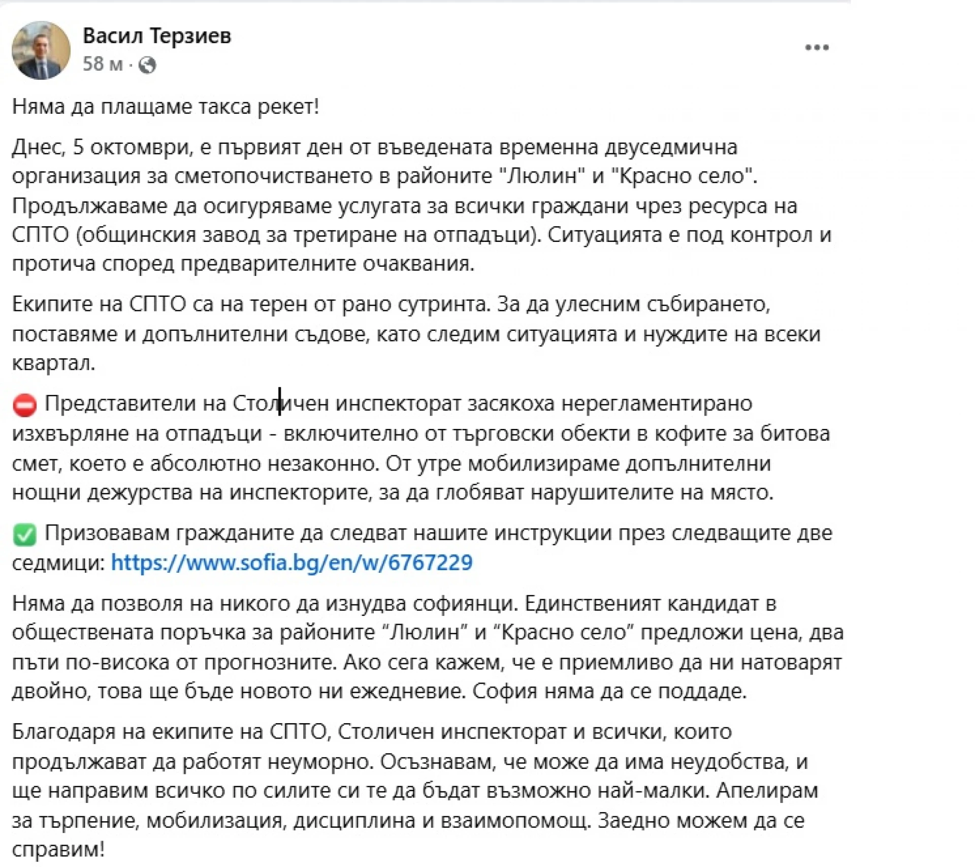 "Няма да позволя на никого да изнудва софиянци. Единственият кандидат в обществената поръчка за районите “Люлин” и “Красно село” предложи цена, два пъти по-висока от прогнозните. Ако сега кажем, че е приемливо да ни натоварят двойно, това ще бъде новото ни ежедневие. София няма да се поддаде. Няма да плащаме такса рекет", написа още Терзиев.