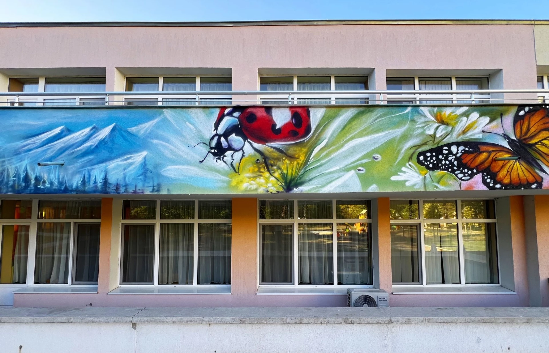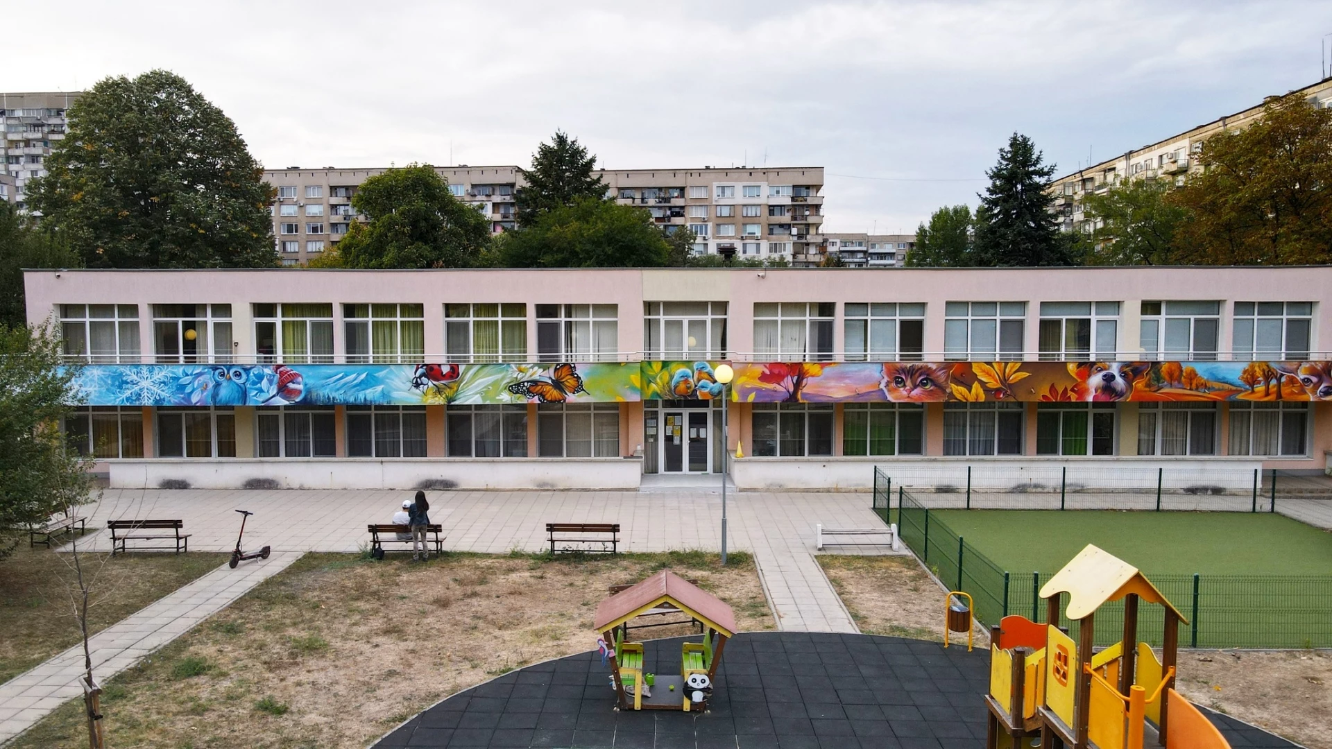 Фасадата на детска градина №12 "Лилия" в столичния ж.к. "Мусагеница" бе преобразена и грейна в пъстри цветове. Приказната картина, озаглавена "Четирите сезона", е дело на младия творец Иван Янков, по-известен в арт средите като Esteo Esteroni.