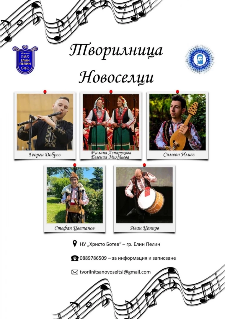 Седмицата на отворените врати в “Творилница Новоселци”, община Елин Пелин, премина с много песни, танци, музика и усмивки! Присъстващите се запознаха с преподавателите по гайда, тъпан, кавал, гъдулка и народно пеене, които представиха дейността си и споделиха интересни истории за своя път в музиката. Всеки от тях разказа как се е запалил по българските инструменти и пеенето, за първите си стъпки, за пътуванията и концертите си в чужбина, както и за това какво му дава народната музика, как се приема тя у нас и по света и защо е важно да я познаваме и съхраним.