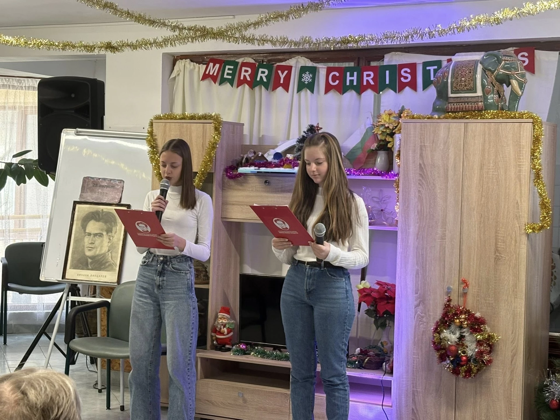 Прекрасен коледен подарък получиха домуващите в Дом за стари хора „Сем. Калинкови“. Учениците от ПТГ „Никола Вапцаров“, заедно с малчуганите от ДГ „Звънче“, зарадваха възрастните хора с вълнуваща празнична програма – песни, танци и пиеса-етюд от живота на патрона на гимназията, представени с много обич и внимание.