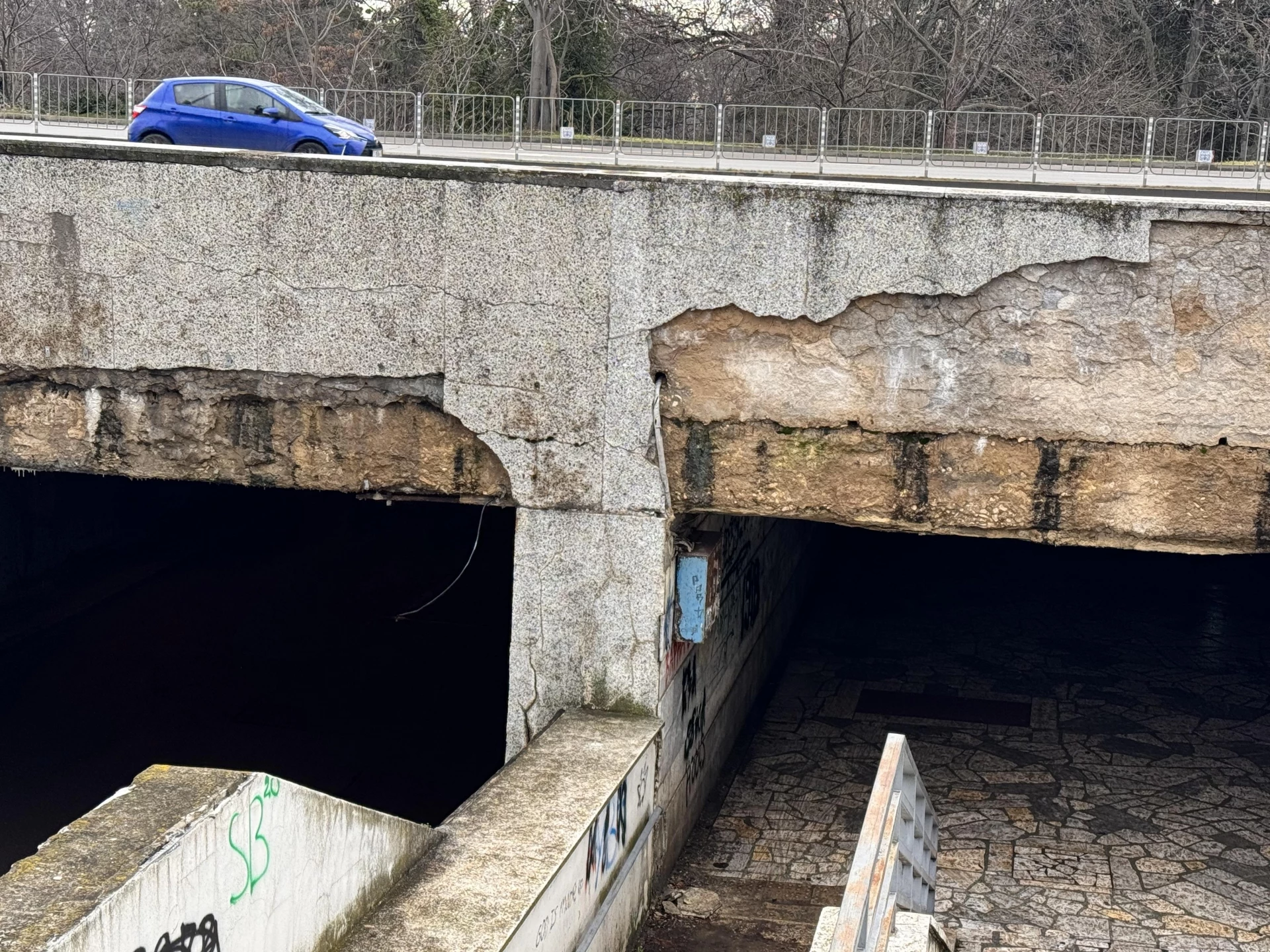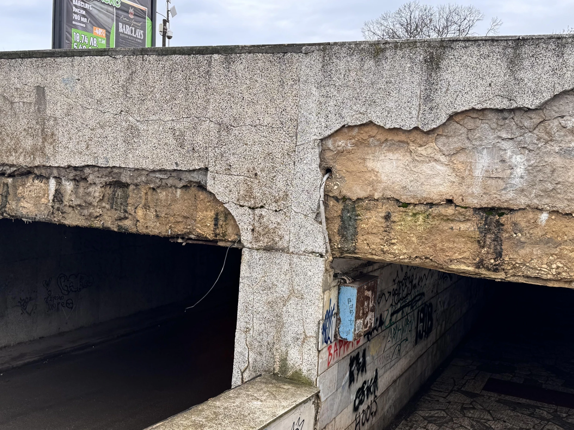 Съоръжението, което се състои от пешеходна и автомобилна част, е видимо разрушено - по тавана и стените се забелязват напукана и разпадаща се мазилка, висящи кабели и счупени елементи.